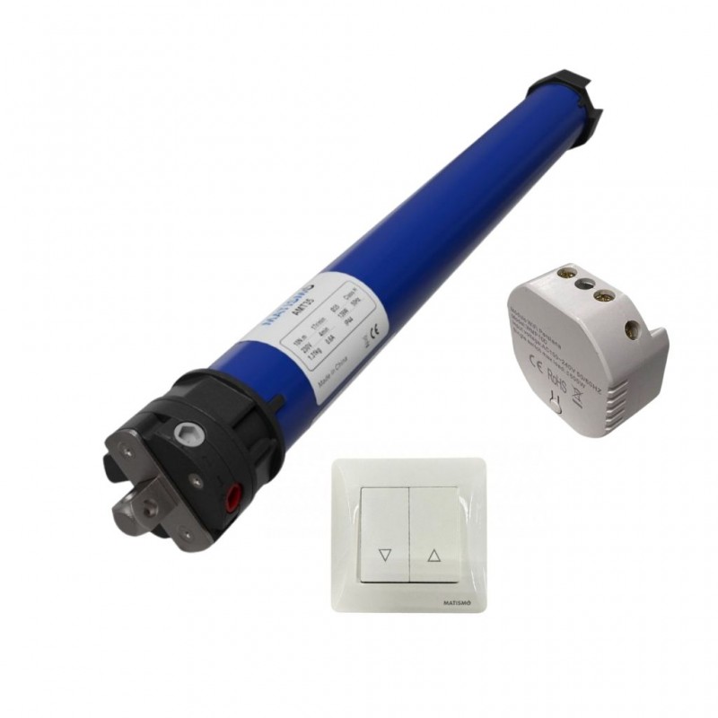 Kit motor de persiana AMT35 para eje de 40 mm que incluye interruptor convencional y módulo wifi para controlar con el dispositivo móvil.