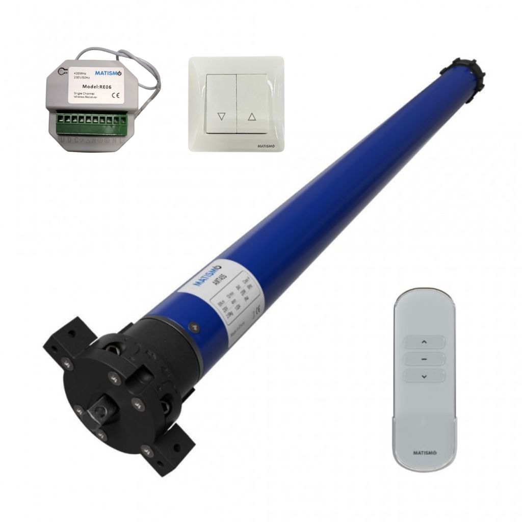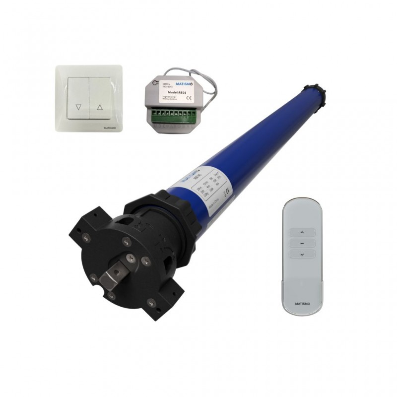 | - Un motor tubular AMT45 20 Nm. - Un adaptador para eje octogonal de 60 mm. - Una varilla de configuración de finales de carrera. - Un soporte para fijar la cabeza del motor. - Un manual. - Un receptor de radiofrecuencia RE06 compatible también con Broadlink RM4 PRO. - Un mando a distancia ME18. - Un interruptor blanco MIP100. |