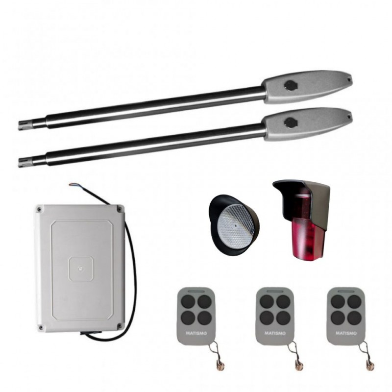 Este kit se ha formado para puertas batientes de dos hojas de hasta 5 metros cada una y con un peso máximo de 350 Kg, prácticamente no habrá puerta